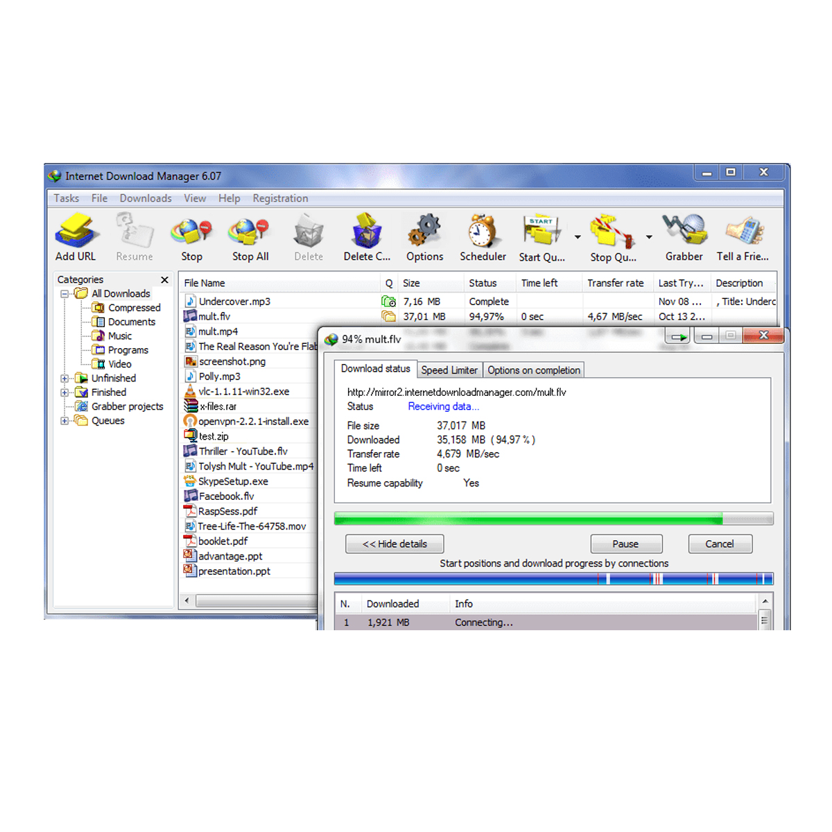 Internet Download Manager (IDM) is a tool to increase download speeds by up to 5 times, resume and schedule downloads. Comprehensive error recovery and resume capability will restart broken or interrupted downloads due to lost connections, network problems, computer shutdowns, or unexpected power outages. Simple graphic user interface makes IDM user friendly and easy to use.Internet Download Manager has a smart download logic accelerator that features intelligent dynamic file segmentation and safe multipart downloading technology to accelerate your downloads. Unlike other download managers and accelerators Internet Download Manager segments downloaded files dynamically during download process and reuses available connections without additional connect and login stages to achieve best acceleration performance.